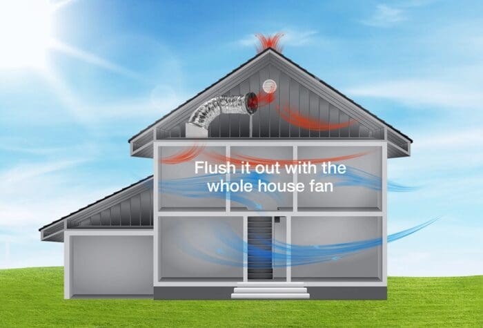 Solatube Whole House Fans do not recirculate the air in the home like a traditional air conditioner. Instead, the system replaces indoor air with fresh air by pulling fresh outside air through the windows and pushing hot, stale indoor air through the attic and out the vents. During warmer months, an energy-efficient whole house fan can help cool the home and attic by up to 30 degrees and save homeowners up to 90% off their A/C bill.