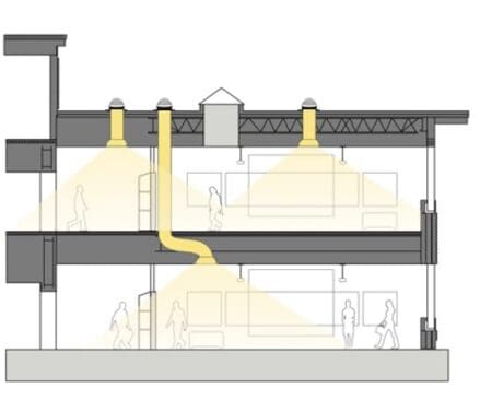 - Adaptable and Reconfigurable: One of the best features of a TDD is the flexible tube design which can adapt to the ever-changing building interior needs.Since TDDs are designed to effectively distribute harvested daylighting throughout the building using advanced optical light guides, the rooftop apertures can be easily relocated from the location of where the daylight is actually used in the building’s interior. As a result, a single-ganged flashing system can be used to effectively daylight multiple interior spaces, whether they are on the same floor, or even different floors of the building.The ability to untether the rooftop apertures from needing to be located directly over the space being daylit means that the rooftop apertures can be located where they naturally fit within the building’s structural system and layout, thereby simplifying the structural design complexities associated with traditional skylight-based daylighting solutions.