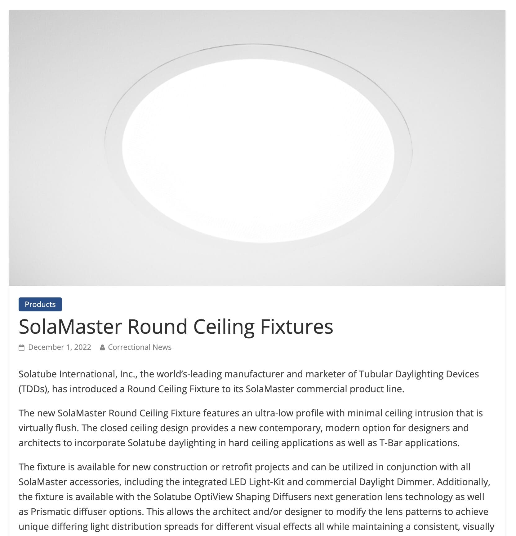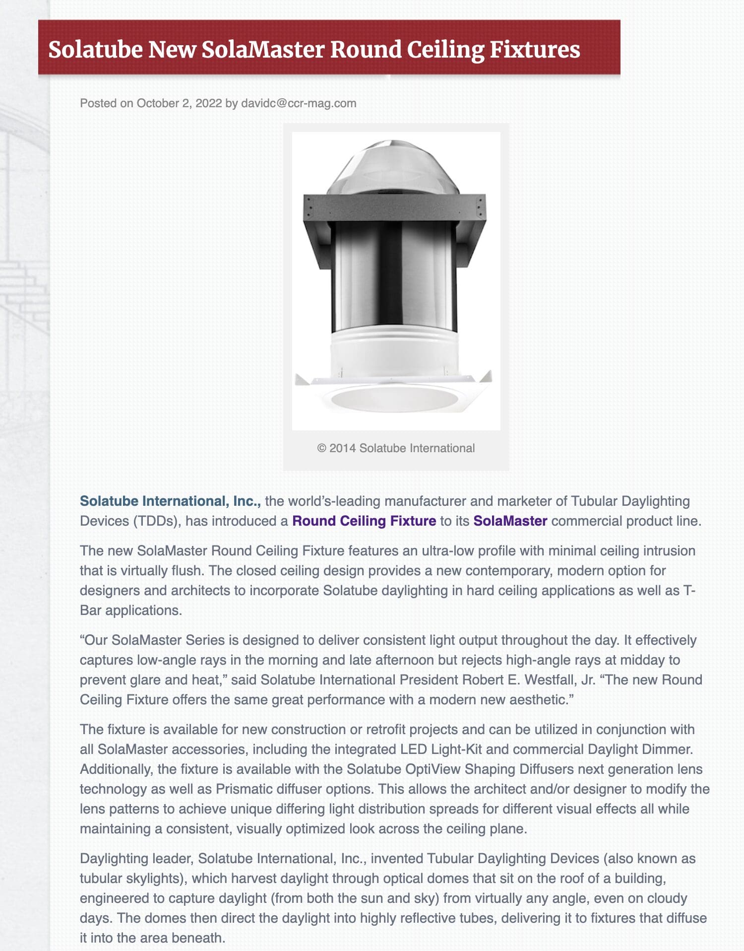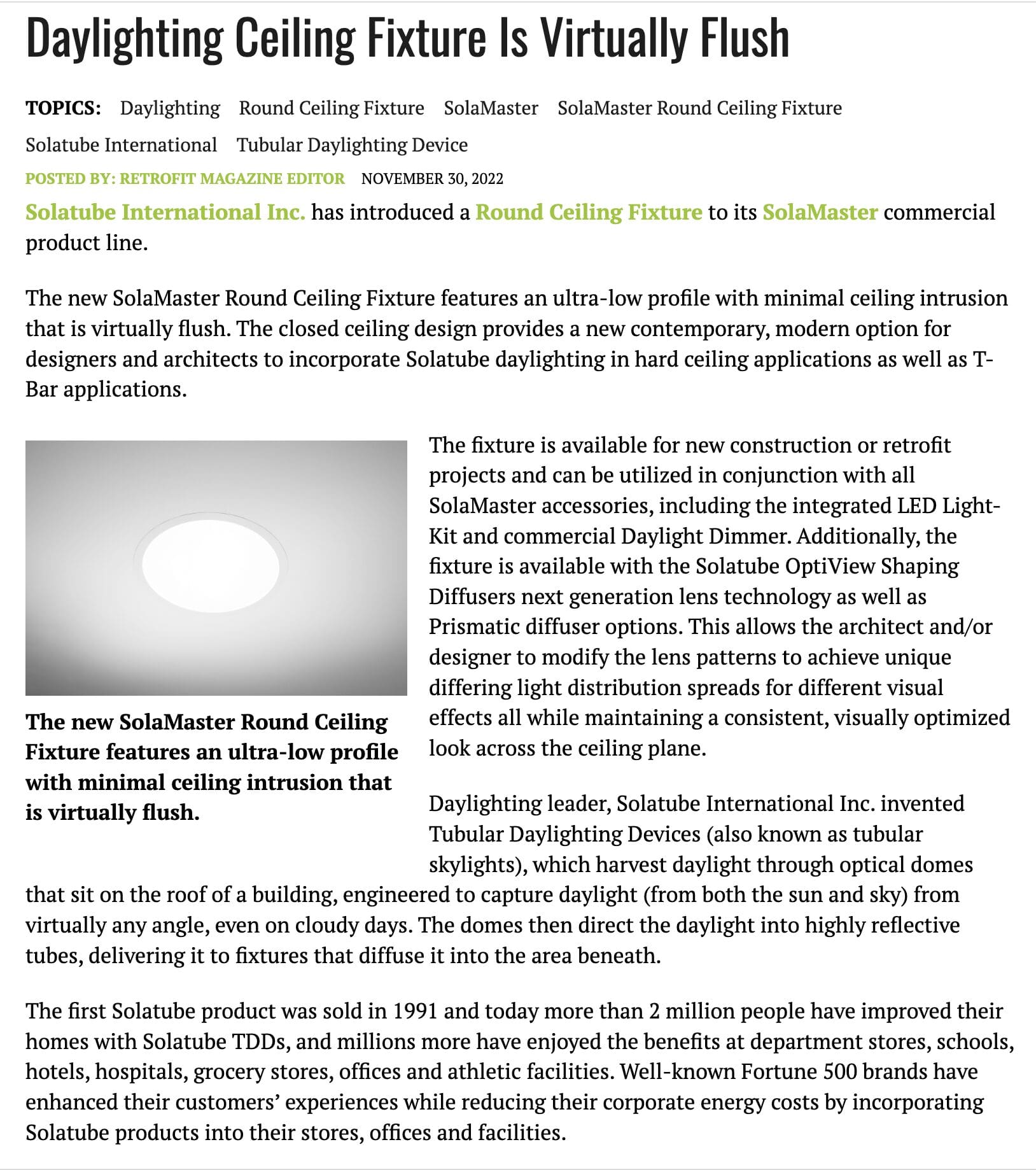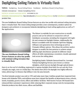 Solatube International Inc. has introduced a Round Ceiling Fixture to its SolaMaster commercial product line.